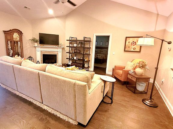 Move-In Ready! Welcome to this elegant villa where style and comfort come together beautifully. This beautiful, upscale villa features a handsome brick front and a low-maintenance exterior for easy living. Inside, the main level offers two spacious bedrooms and two full baths, while the upper level provides a flexible third bedroom or bonus room—ideal for guests or office space. The open-concept layout seamlessly connects the kitchen, dining, and great room, creating a bright and welcoming living space perfect for entertaining or relaxing at home. The gourmet kitchen is a chef's dream, featuring crisp white shaker cabinets, quartz countertops, a 10-foot island with bar seating, stainless steel appliances, and a timeless subway tile backsplash. A decorative ceramic tile gas fireplace adds ambiance and charm to the great room, highlighted by the 15' vaulted ceiling. Rich hardwood floors flow throughout the entire first floor, creating warmth and harmony to the home's connected living spaces.