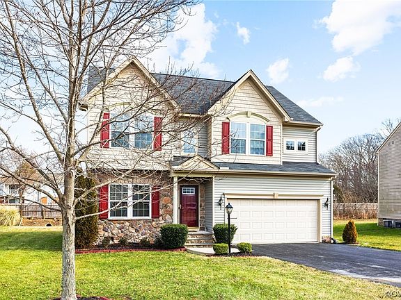 This move-in ready home features NEW paint and NEW carpet throughout! Stepping inside this open concept home you’ll find the living room with carpet that would make a great office or secondary entertainment space. The spacious family room features carpet and a ceiling fan/light and is open to the kitchen with a HUGE center island! Kitchen features include: granite counters, island, 36” cabinets, stainless steel appliances, gas stove, barstool area, pantry, recessed lighting and fridge to convey. An adjoining morning room upgrade offers a vaulted ceiling, chandelier and glass doors leading to the rear deck. A designated entry area off of the garage door makes the perfect drop-zone and a half bath completes the first floor. A two story staircase, with a large window and chandelier, gives the home an open and airy feel. The primary bedroom features carpet, ceiling fan/light, an enormous walk-in closet and ensuite bath with vinyl floors, double vanity, extended walk-in shower and linen closet. Bedrooms two and three with carpet and closet. Bedroom four with carpet, double door closet and ceiling fan/light. A full hall bath with vinyl flooring offers a tub/shower combo. A spacious laundry room with washer/dryer to convey and storage closet completes the second floor. Enjoy easy access to I-64 and I-295.
