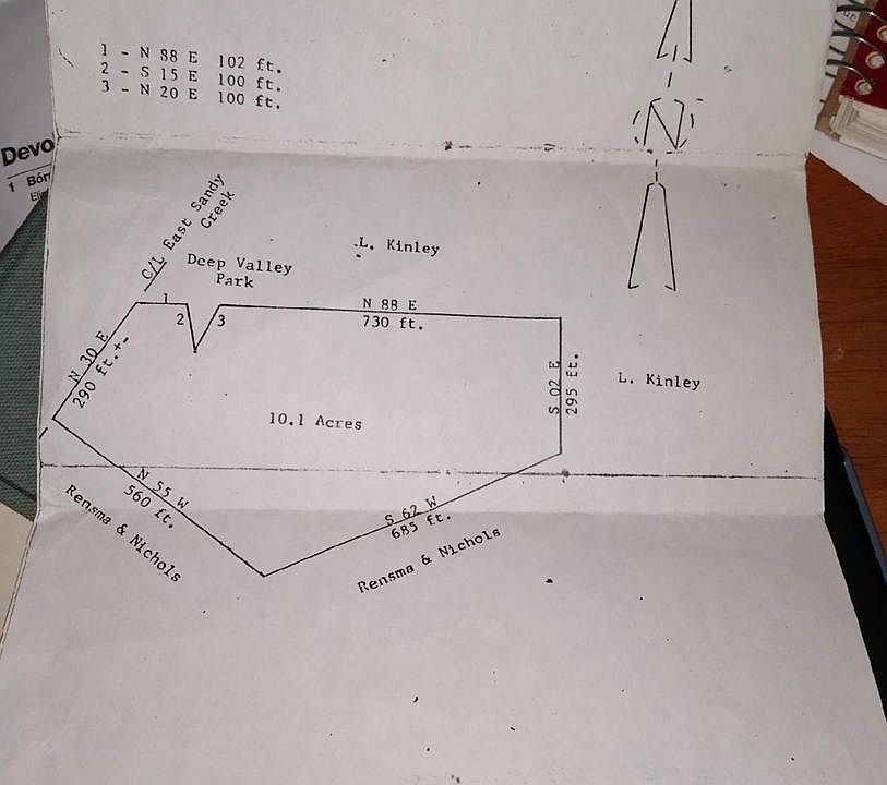 Nice private 10.1 acres located in Rockland Township. Great area for Hunting and Fishing and within walking distance to Sandy Creek Trail . Property does include an older Trailer, Shed and Pavilion. Pretty steep hill to access East Sandy Creek but could make some switchbacks for easier access. Property is being sold cash as is with no guarantees or warranties.