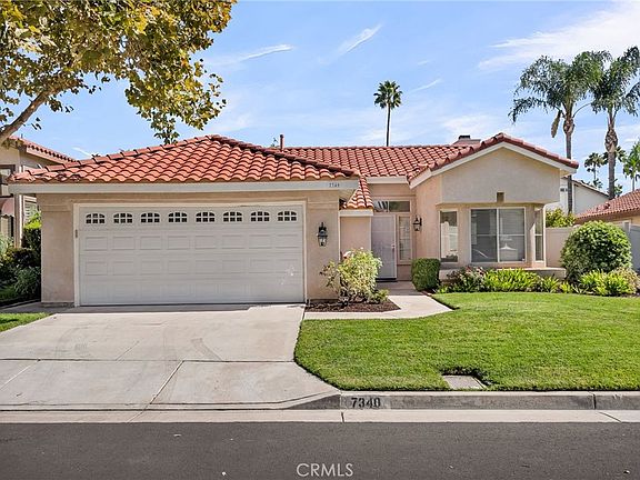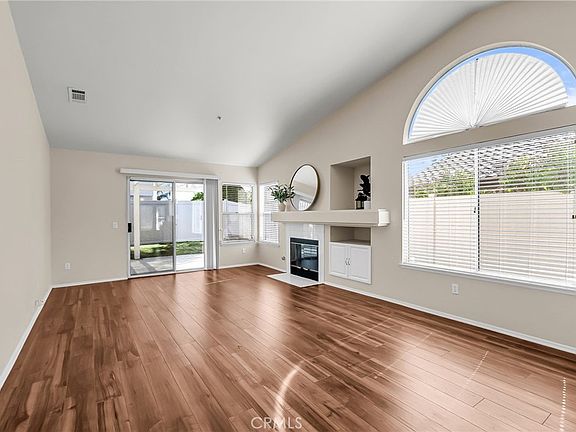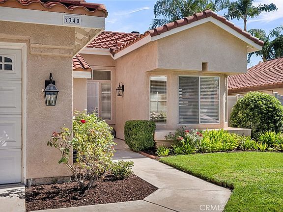 Welcome to this peaceful and inviting single-story residence nestled within the private gated Mission Village community, located in the desirable Mission Grove neighborhood. This home boasts a welcoming front yard that sets the tone for the warmth and comfort found inside. Step through the entry and you'll find laminate plank flooring flowing throughout the living area, complemented by vaulted ceilings and large arched windows that fill the space with natural light. A tiled fireplace, flanked by a media niche, adds character and charm to the living room—perfect for relaxing or entertaining. The bright galley-style kitchen features recessed lighting, white cabinetry, tiled countertops, and a cheerful breakfast nook ideal for morning coffee. The spacious primary suite offers a walk-in closet with organizer, vaulted ceiling, ceiling fan, and an en-suite bath complete with a walk-in shower, dual sink vanity, and a generous linen cabinet. Two additional bedrooms are thoughtfully spaced, and the guest bathroom includes a convenient tub/shower combination. Step outside to enjoy the serene backyard, perfect for outdoor dining under the lattice-covered patio or playtime on the lush lawn. Additional highlights include vinyl fencing, built-in garage cabinetry, an oversized two-car garage, community playground and a prime location near shopping, parks, and schools.