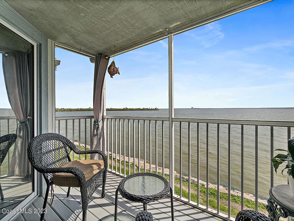 Stunning, direct panoramic views of the Indian River greet you as you enter this beautiful 3 bedroom/2 bathroom end unit condo. Watch rocket launches from the Kennedy Space Center as well as amazing sunrises from inside the condo or on the screened balcony that offers a large storage room. Updates to this condo include new kitchen cabinets, counter tops, appliances, garbage disposal, water filter system, water heater, primary bathroom vanity, faucets, vinyl flooring in kitchen and bathrooms, new carpet and paint throughout the condo and more. Resort style amenities include 2 heated pools with hot tubs, saunas, club house, tennis courts, shuffleboard and fishing pier. Don't let this hard to come by 3 bedroom direct river condominium get away. Schedule a showing today.