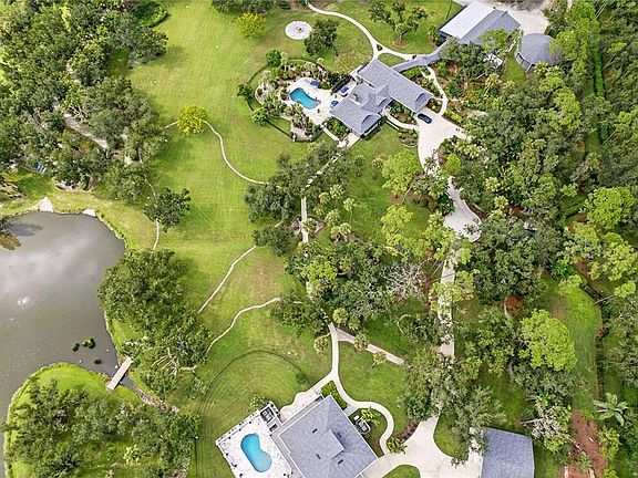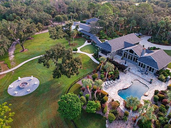 Welcome to The Palomino Estate — a private, 17-acre gated oasis unlike anything else in Sarasota County. Located just 10 miles from Siesta Key Beach and 15 miles to downtown Sarasota, this extraordinary property blends resort-style living with the peace and privacy of the countryside. Set within the equestrian community of Saddle Creek, where horse enthusiasts are welcome to use the 31 miles of riding trails, this multi-residence estate offers over 15,000 sq ft under air across multiple structures, including two custom homes, a 5,000 sq ft air-conditioned “barndominium” and entertainment pavilion, and multiple garages. Behind an eight-foot perimeter fence with dual gated entries, you’ll find lush tropical landscaping, privacy berms, and nature trails weaving through the property. You can stroll through the bamboo forest and reflection garden while enjoying multiple ponds for fishing or kayaking. A raised wooden boardwalk winds through the property offering biking and hiking adventures, while a lighted pickleball, tennis, and basketball court with gazebo creates endless opportunities for recreation. In the center of the compound, a massive stone firepit anchors the grounds for gatherings under the stars. There is plenty of space to have a garden or raise livestock.This expansive estate features two custom residences with pools, plus an entertainment barn constructed of solid block. The barn includes two bedrooms, two bathrooms, a full-saloon-style bar, kitchenette, gym, sauna, golf simulator, movie theater, game room, and outdoor kitchen, creating a space that feels like a private resort. A separate air-conditioned garage with 11-foot ceilings offers space for cars, boats, equipment, and more, while another detached garage adds even more covered parking and storage.Together with the barn, the two homes offer eleven bedrooms, nine and a half bathrooms, and over fifteen thousand square feet under air (more than twenty-two thousand total), making this property ideal for multi-generational living, entertaining, or use as a private retreat.Each structure is equipped with whole-home generators, water filtration systems, and impact windows and doors, along with modern security and digital gate entry panels.Recent improvements include new roofs on every structure in 2023, resurfaced pools with travertine and flagstone decking, composite decking and railings, landscape lighting, golf simulator and sauna installations in 2023, and freshly paved asphalt and concrete driveways, and fencing for pets.The main residence offers expansive living areas, soaring ceilings, a massive stone fireplace great room, multiple en-suite bedrooms, an in-law suite with its own kitchen, and relaxing poolside views. The guest residence has been completely renovated with high quality finishes and could serve as a primary home for your extended family. It features a bright open floor plan with gourmet kitchen and second story wrap-around deck for 360-degree nature views. This home also features a private resort-style outdoor area overlooking the lake. This estate was designed for comfort, recreation, and peace of mind, with every detail crafted for privacy and long-term enjoyment.Whether used as a private family compound, equestrian hideaway, or corporate retreat,The Palomino Estate represents a property that truly has it all—green space, activities, security, luxury, and serenity—all just minutes from Sarasota's world-famous beaches, dining, and shopping.