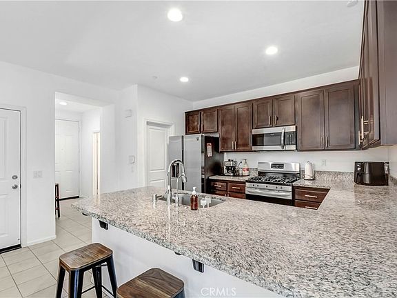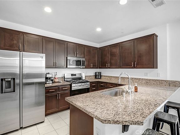 WELCOME HOME to the FHA APPROVED private, and gated community of Granite Ridge in Jurupa Valley! This amazing DETACHED tri-level home offers 2,100 square feet of living space, featuring 4 bedrooms and 3.5 bathrooms with a converted loft that currently serves as a 5th bedroom. As you enter the home, you will find freshly painted walls with ceramic tile flooring, a first level guest bathroom and direct access to the 2-car garage. As you proceed into the upgraded kitchen with pantry you will notice the granite countertops and espresso shaker cabinets that complement the stainless-steel appliances. The kitchen seamlessly opens to the family area, perfect for entertaining guests with direct access to the backyard. On the second level you will notice the high ceilings, you'll find the spacious primary bedroom with a private en-suite bathroom, two secondary bedrooms with a shared bath complete with double sinks, quartz counters, and espresso shaker cabinets, and a large laundry area complete with a utility sink and storage space. The third level offers a fourth bedroom and full bathroom with a loft/5th bedroom that is ideal for guests or home office. This energy-efficient home includes Solar panels, a tankless water heater and radiant barrier roof panels. The community offers amenities such as parks, playgrounds, and hiking trails that provide endless opportunities for recreation. Conveniently located near schools, shopping centers and easy access to all major freeways. A perfect place to call HOME!