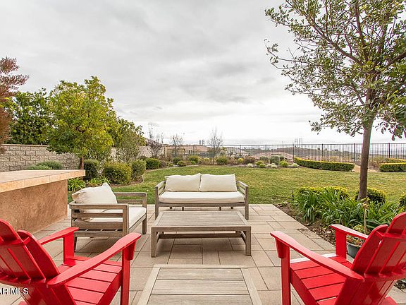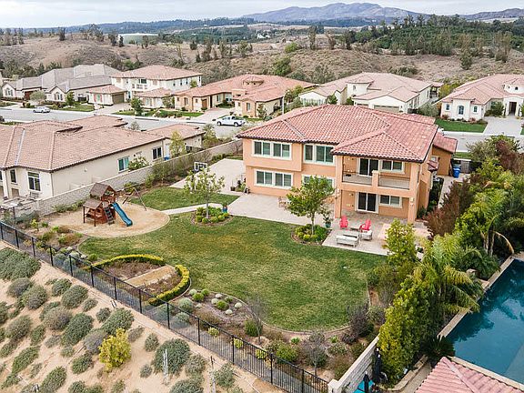 Welcome to this modern estate in the gated Masters at Moorpark Country Club Estates with 5 bedrooms, 6 bathrooms and 4,967 square feet on a 20,000+ square foot flat lot! Step into the stunning entry showcasing the impressive dual staircases and chandeliers, leading to the separate living room and family room perfect for entertaining your family and guests. The expansive kitchen, which opens to the spacious family room, is the perfect space for gourmet cooking including a large center island, built-in refrigerator, double ovens, microwave, 6-burner cooktop with additional griddle, and a walk-in pantry. Also located downstairs is a spacious office, powder room, and downstairs bedroom with en-suite bathroom. The master suite is fit for a King with enough space for a lounging area, balcony with gorgeous views, and bathroom suite with two large walk-in closets, dual vanities, oversized shower, and tub perfect for relaxing at the end of the day. The three secondary bedrooms upstairs each feature their own en-suite bathroom. The backyard is full of fun amenities including a playground, basketball court, built-in BBQ and bar, large grassy areas, side yard perfect for a dog run, and enough room to fit the pool of your dreams if you desire. Other amenities of this turnkey home include a spacious laundry room with built-in cabinets and sink, brand new interior paint, new wood flooring throughout, 4 car garage space with storage racks, camera and security system, and so much more!