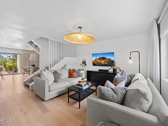 Beautifully updated townhome featuring 2 spacious primary bedrooms with ensuite baths and walk-in closets, plus a guest powder room on the main level. The open floor plan highlights a remodeled kitchen with granite countertops, breakfast bar, newer cabinets, and stainless steel appliances. Updates include new flooring, redesigned staircase, refreshed pantry, upgraded primary bath, double-pane windows, fresh paint, and inside laundry with washer & dryer. Relax on the private patio with storage, just steps from the pool. Conveniently located near Scottsdale Fashion Square, Old Town, restaurants, arts, golf, Spring Training, and Loop 101. Beyond the basics, this home offers thoughtful design touches and upgrades throughout. Both primary suites are generously sized with large walk-in closets and updated bathrooms. The living area flows seamlessly into the dining and kitchen spaces, creating an inviting environment for entertaining. The staircase has been reimagined with a fresh, modern design, while the pantry and guest powder room add convenience and function.
