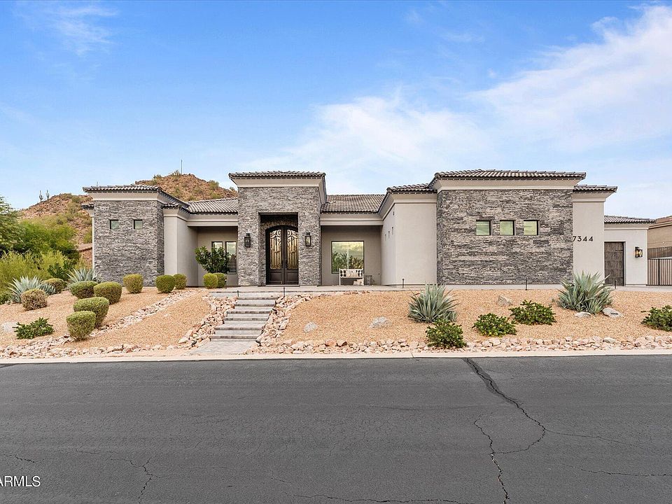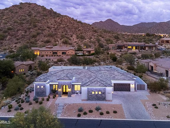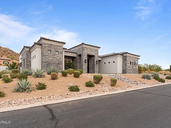 This farmhouse modern home is an absolute stunner The minute you walk through the double Iron doors into the gorgeous foyer. The home features Soaring twenty foot ceilings, gorgeous wood shiplap and trim throughout. Thoughtfully designed open floorplan that has a huge family room with a sliding wall of glass that brings the outdoors inside. The home has 4 bedrooms. A large media room, and 4 and Half baths. 2 entrances from the garage into a large laundry room or into a customized mud room. The Kitchen is the centerpiece if this home with white cabinets, storage galore. GE Monogram built in appliances, double ovens, griddle, 6 burner cook top, ice maker, and lots of custom features that make the kitchen super functional. All bedrooms have baths. Walk in closets and 10-foot + ceilings. The Theatre room is multipurpose and opens directly to the backyard. Extra Features of the home include wood shutters, PO System, a 10k Holiday Built in Lighting package that surrounds the entire home perimeter. The beautiful yard is set up for entertainment from the sprawling Turf Lawn to the large, covered Lounge patio, spiral stairs to the expansive view deck with 180-degree views of the valley. The pebble tec pool has a resort like waterfall, kids Slide and fun grotto seating. The side yard has a paver court that can be used for storage or a kid's sport court. The extra wide and deep garages are designed to hold all the cars, storage items and toys suited for the Arizona lifestyle.
