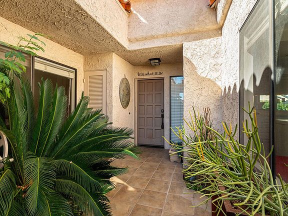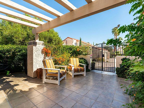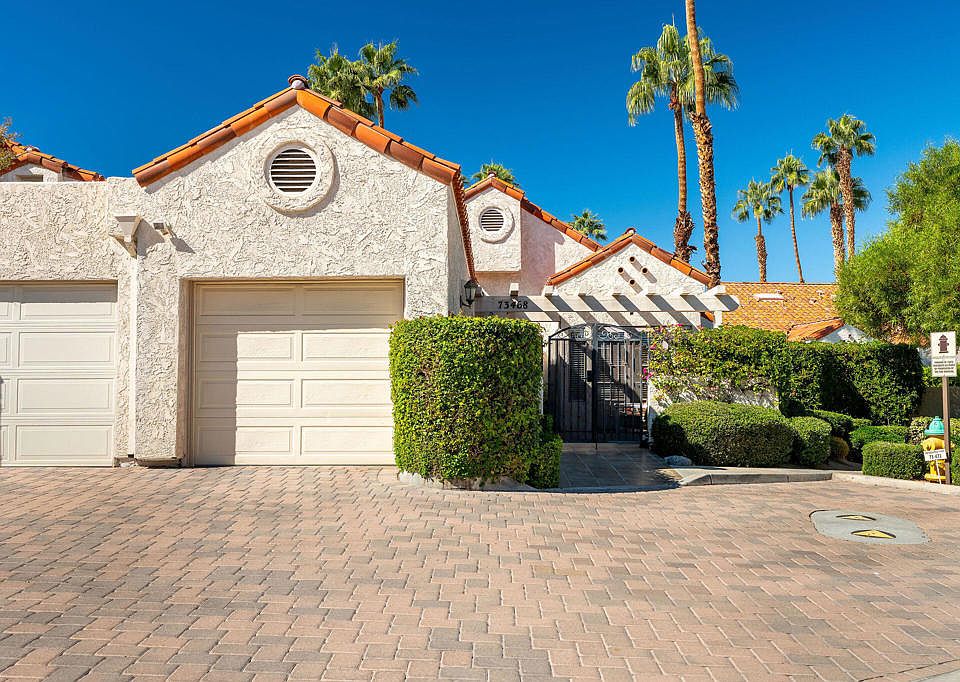 Desert Living at El Paseo Village!Step into this charming end unit just steps from El Paseo and The Gardens, offering the perfect blend of comfort and convenience. This rarely available home features 2 spacious, separated master suites each with walk-in closets and private baths with dual vanities plus a guest half bath. The primary suite includes a walk-in closet and ensuite bath with dual vanities. The guest suite offers its own private bath with shower The open, light-filled layout showcases 16ft vaulted ceilings, hardwood floors, a beautiful stone fireplace, and a formal dining area perfect for entertaining. The large eat in kitchen opens to private front and rear patios complete with a built-in gas BBQ, a private 2 car garage. Two sparkling pools and two lighted tennis courts. Well maintained community. Just a short walk to El Paseo's Luxury shopping, dining, and art galleries. Call for a private tour.