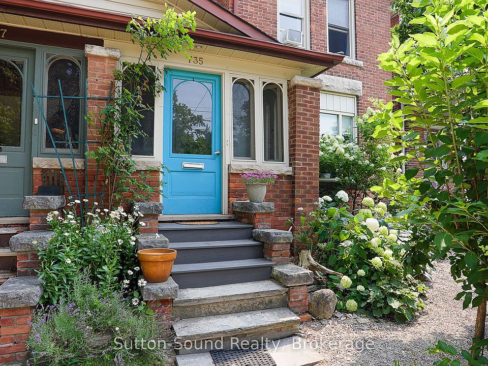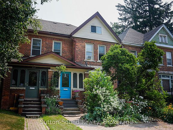 Welcome to this beautiful 2.5-storey red brick semi-detached home, ideally located just steps from Owen Sounds vibrant downtown and picturesque River District. Brimming with historic charm and modern updates, this spacious home features high ceilings, elegant original woodwork, and an open-concept living and dining area perfect for entertaining. The kitchen offers a functional workspace with a central island, while the sunroom at the back of the home provides a cozy retreat with patio doors leading to a private deck and a beautifully landscaped backyard. Mature perennial gardens, a flagstone walkway, and established trees create a peaceful, park-like oasis in the heart of the city. Upstairs, you'll find four bedrooms (one currently converted to an upper-level laundry), and two bathrooms one conveniently located on the main floor. The finished third level adds a versatile bonus space ideal for a home office, playroom, or guest suite. Additional features include parking for two vehicles, a newer gas boiler (2018), and a roof replaced in 2010. This home blends rustic charm with urban convenience and is surrounded by the best of Owen Sound museums, art galleries, restaurants, Harrison Park, walking trails, and cultural events all nearby. Don't miss your chance to own this unique and inviting home in a thriving community!