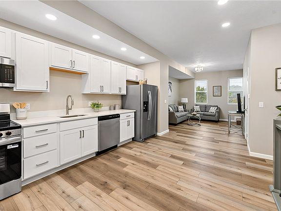 Quartz countersCovered front porchSlow close white cabinetryDining areaBeautiful floorsStunning kitchenStainless steel appliances