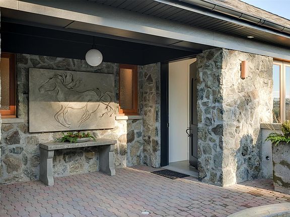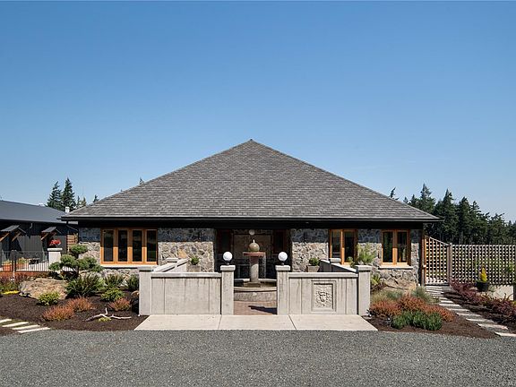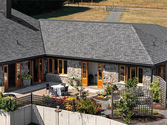 Metchosin Artistic Treasure. This outstanding 4,000+ sq ft one-level home is fashioned to withstand the passage of time. The imposing granite exterior with wrought iron embellishment & concrete water feature heralds the quality & distinctiveness of the interior of this French provincial inspired residence. Polished concrete floors, exposed beams, in-laid wood feature floors & reclaimed brick accents make it warm & inviting with refreshing originality & artistic flourish rarely seen in new builds. The spacious great room boasts a magnificent bespoke fireplace & multiple custom French doors give access to the patio. A sep. prep area is a feature of the well-laid out kitchen. The primary retreat will satisfy any discerning buyer. Geo-thermal heating reduces the carbon footprint. An auxiliary building includes a 1,380 sq ft art studio w/ bathroom, workshop & garage. Nestled in the rolling hillside, on 2.4 acres with views across Haro Strait to the Olympic mountains