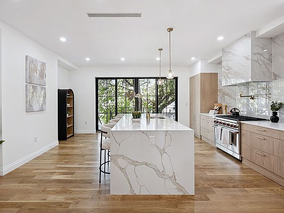 The owner’s layout includes three spacious bedrooms with soaring ceilings, skylights, and an open concept main level filled with an abundance of natural sunlight. The chef’s kitchen is outfitted with imported Italian cabinetry, a Wolf oven, a Fisher & Paykel refrigerator, and premium appliances, blending modern aesthetics with top-tier performance. A floor-to-ceiling glass door just off the kitchen opens onto a large private deck, perfect for entertaining and overlooking a landscaped backyard oasis.