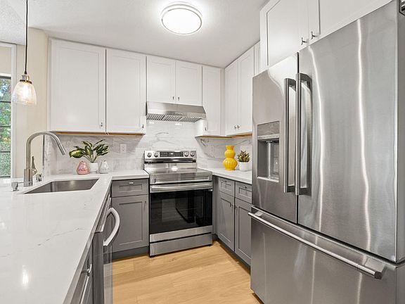 Lowest priced 2 bedroom condo in Burlingame located in close proximity to Burlingame Avenue and downtown! Spanning 993 square feet, this tastefully renovated condo boasts new wood floors throughout, new appliances, kitchen cabinets and counter tops, light fixtures and much more. This first floor corner unit is located at the rear of the building allowing abundant natural light into almost every corner of the home.Enjoy the comforts of a spacious living room leading to a light-filled sun room with access to a concrete patio overlooking the common pool area. The open kitchen comes fully equipped with all new modern appliances including a refrigerator, and dishwasher making meal preparation a breeze. Adjacent dining area and counter top bar eases the service and consumption of meals. The flooring throughout the home ensures a clean and attractive look suitable for various interior design choices. The secluded bedroom leads into the updated bathroom with double sinks and shower over tub. Convenience is key with an in-unit washer and dryer ensuring laundry tasks are handled with ease. This home is located within the Burlingame School District. An assigned single-car parking space inside the gated common garage is included.