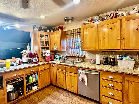 Metal privacy fenceGranite countertopsCovered patioSpacious kitchenOverlooks the family room