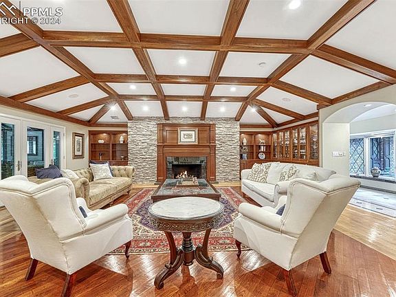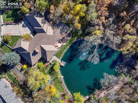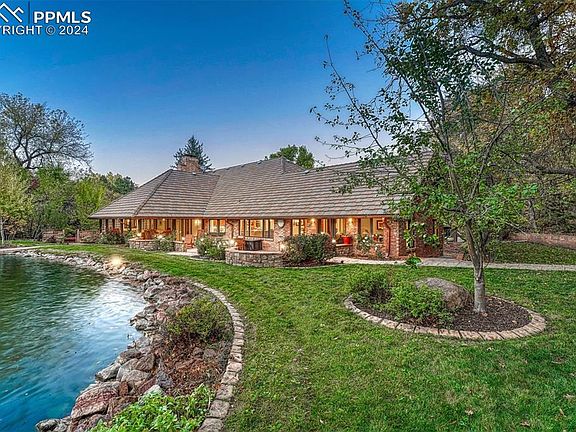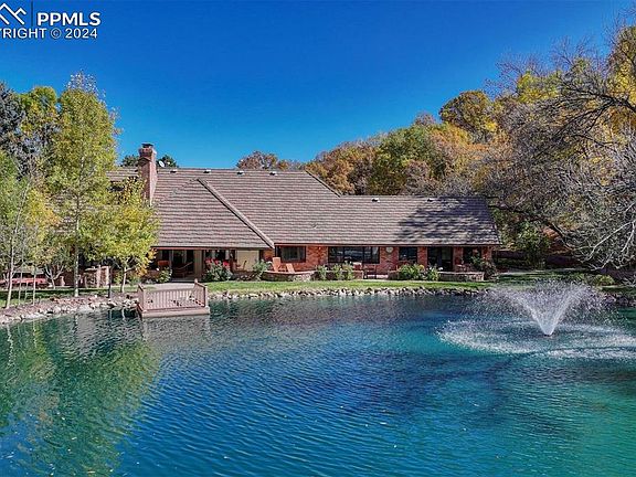 Discover your private oasis in this exceptional stately custom home, nestled on nearly 3 acres of serene beauty and privacy. With a picturesque, one acre trout-stocked pond, this property offers a perfect blend of luxury and tranquility. This spacious residence features five generously-sized bedrooms, three with en-suite bathrooms. The Primary bedroom offers a large walk in closet and expansive bathroom complete with a double sided gas fireplace. Also on the main level are two guest suites, a half bath, office and laundry room. The walk-out basement apartment has two large bedrooms, a full kitchen and bathroom adding versatility, perfect for extended family or as a rental opportunity. Step inside to find elegant hardwood and marble floors that flow throughout the home, exuding sophistication at every turn. The expansive travertine covered patio is designed for entertaining, complemented by walking trails to the charming gazebo and a grand pavilion, making it ideal for gatherings or peaceful evenings under the stars. Experience the ultimate lifestyle of privacy, comfort, and natural beauty in this stunning water front home near the Broadmoor.