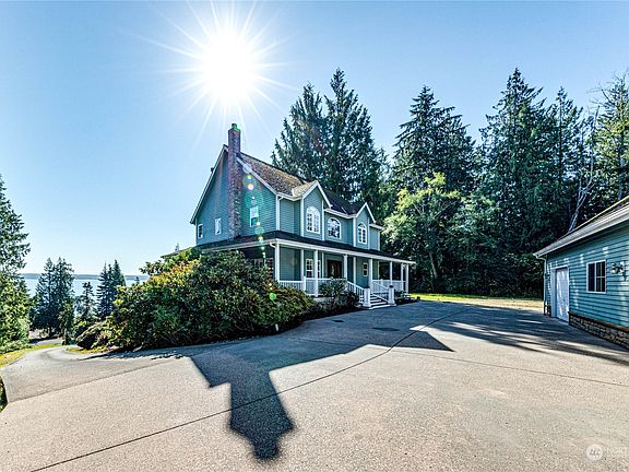 Amazing Home on Tala Shores Dr. Private double lot, 2,235 SQ FT of living space. Elegant Main Floor, inlaid wood entry, Solid Mahogany Mantle, rolled wall w/wainscoting in dining room, sunroom to relax in, access to deck & views of Hood Canal. Expansive Kitchen, granite countertops, HUGE island, w/seating, bulk bins, New Dishwasher, Bonus Room off kitchen & guest bath. Upper level has primary w/fireplace, custom built closets/drawers, jetted tub, guest bedroom, 3/4 guest bath, utility room w/extra storage space, office w/built in desk & lower cabinets. Outside is Landscaped, with deck for entertaining & covered wrap around front porch. Detached 3/Car garage, pellet stove, workshop area. Woodshed w/wood. Near Port Ludlow Marina & Hood Canal.