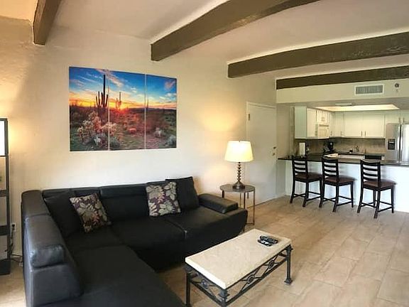 Escape to your private oasis in this delightful condo located in the heart of Scottsdale. Perfectly situated within the same complex as Scottsdale Independent 47 Hotel. This cozy condo offers everything you need for an unforgettable vacation. With easy access to the best local attractions, including Old Town Scottsdale, Salt River Fields baseball stadium, OdySea Aquarium, Talking Stick Casino Resort, and Great Wolf Lodge water park just across the street. Inside, you'll find a spacious and comfortable living area with large windows that let in plenty of natural light. The living room features a plush sofa that doubles as a queen-size bed, perfect for accommodating up to four guests. The bedroom is equally inviting, with a king-size bed and premium bedding that ensures a good night's sleep every night. The full bathroom is stocked with all the essentials you need, including fresh towels and toiletries, so you can travel light. This one bedroom condo also features a fully equipped kitchen with everything you need to whip up delicious meals and snacks, including a fridge, microwave, and coffee maker. The spacious patio offers the perfect spot to relax and soak up the sunshine, with a grassy lawn just steps away from the parking lot. As a guest of the Independent 47 Hotel complex, you'll enjoy access to a range of the hotel amenities. Take a refreshing dip in the heated swimming pool, located just a short walk away, or soak your cares away in the hot tub. The pool area also features comfortable lounge chairs and plenty of shade, so you can spend hours lounging in the sun. Stay connected with free high-speed Wi-Fi, and catch up on your favorite shows with cable TV. You'll also have access to free designated covered parking, as well as any uncovered parking spots that are available. For added convenience, a shared washer and dryer are available for use, located on the second floor behind the elevator. Please note that the laundry room requires 10 quarters per load. Owner pay for HOA, water, electricity, TV cable and WIFI. HOA policy: Non-smoking, Pets are not allowed. Quiet time: 10 PM to 8 AM.