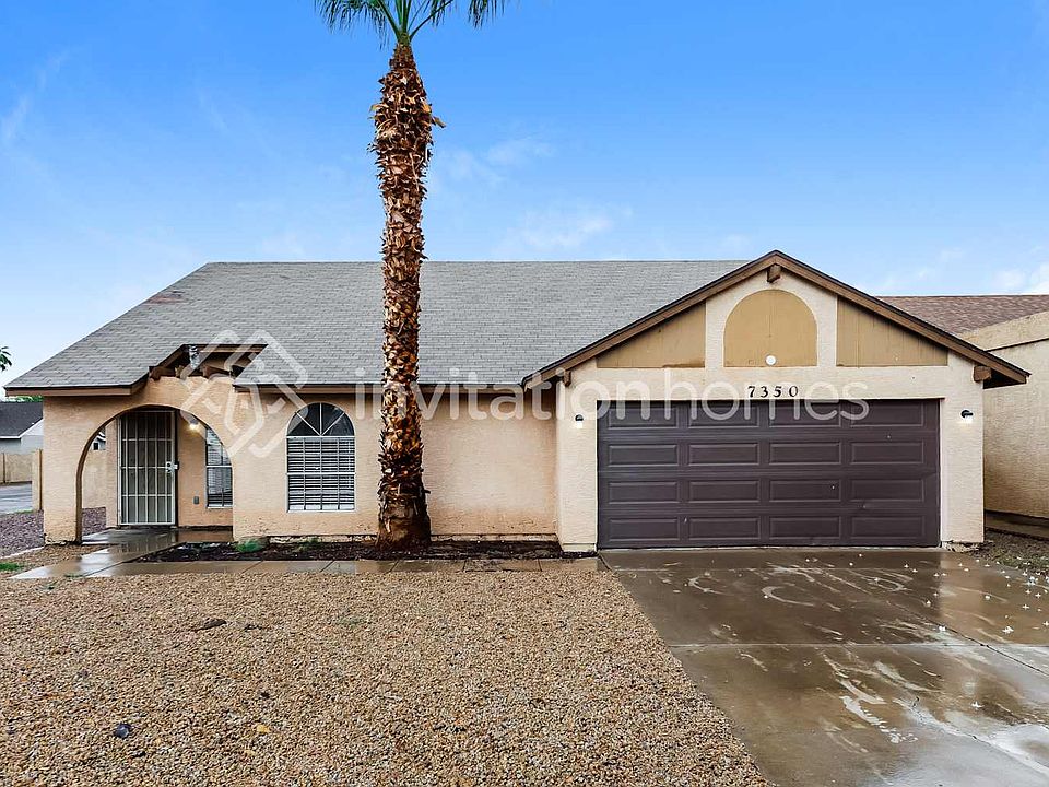 Home Features and Amenities: Air Conditioning, Covered Porch, Fenced Yard, Garage, Granite Countertops, Long Lease Terms, Patio, Pet Friendly, Pool, Primary Bedroom on Main, Recessed Lighting, Single Story House, Smart Home, Stainless Steel Appliances, Tile, W/D Hookups, and professionally managed by Invitation Homes.
