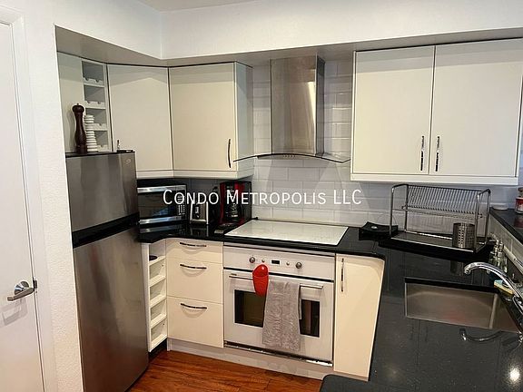 The contemporary kitchen showcases black granite countertops, white cabinetry, and stainless steel appliancesideal for cooking and entertaining. Enjoy distinct dining and living areas, plus the convenience of a laundry closet with full-size washer and dryer. Wood flooring runs throughout the unit, adding a sleek, cohesive look.