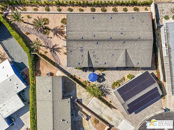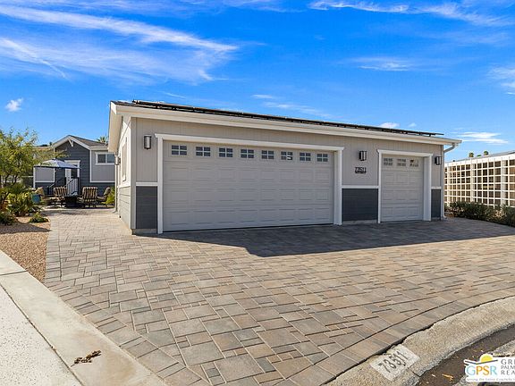 The ONE TO SEE! Built in 2022, you'll love the outstanding VIEWS, stylish finishes, and privacy. Palm Desert Greens Country Club is the backdrop with its active 55+ approach to desert living. Motor down Country Club Drive for a closer look at this lovely setting on Red Circle which delivers on all fronts including gorgeous landscape + hardscape design. At 2,589 square feet, this is one of the larger floor plans designed by Clayton Homes. 3-bedrooms (with possible 4th), plus den, and 2-bathrooms. Rooftop SOLAR plus 2-car detached garage with dedicated golf cart parking. The formal entry leads to living and dining areas framing an island centered kitchen where stylish finishes work their magic. VIEWS TO THE WEST and SOUTH cannot be overstated! French doors swing open from the den to the garden delivering easy indoor-outdoor flow. There's an East-facing patio too. Bedrooms enjoy a nice separation with the Primary Ensuite positioned along a dedicated wing and includes an oversized walk-in closet, handsome built-ins, and spa-inspired bath with dual vanities. Guest Bedroom #2 and Guest Bedroom #3 are located on the opposite end of the home and share a full bath. Nearby home office/study could easily work as Guest Bedroom #4. Utility room with laundry sink features direct access to the patio. Take the Matterport VIRTUAL TOUR for a better sense of flow. Palm Desert Greens Country Club is a private, guard-gated manufactured home community. The 18-hole executive golf course with no initiation fee takes center stage with. Low HOA fees and YOU OWN THE LAND. The clubhouse features a popular restaurant, lounge, and fitness center. There are 3 pools + spas, shuffleboard, tennis, bocci, and busy social calendar! The best of El Paseo and nearby Rancho Mirage are both short hops away. Enjoy it all.