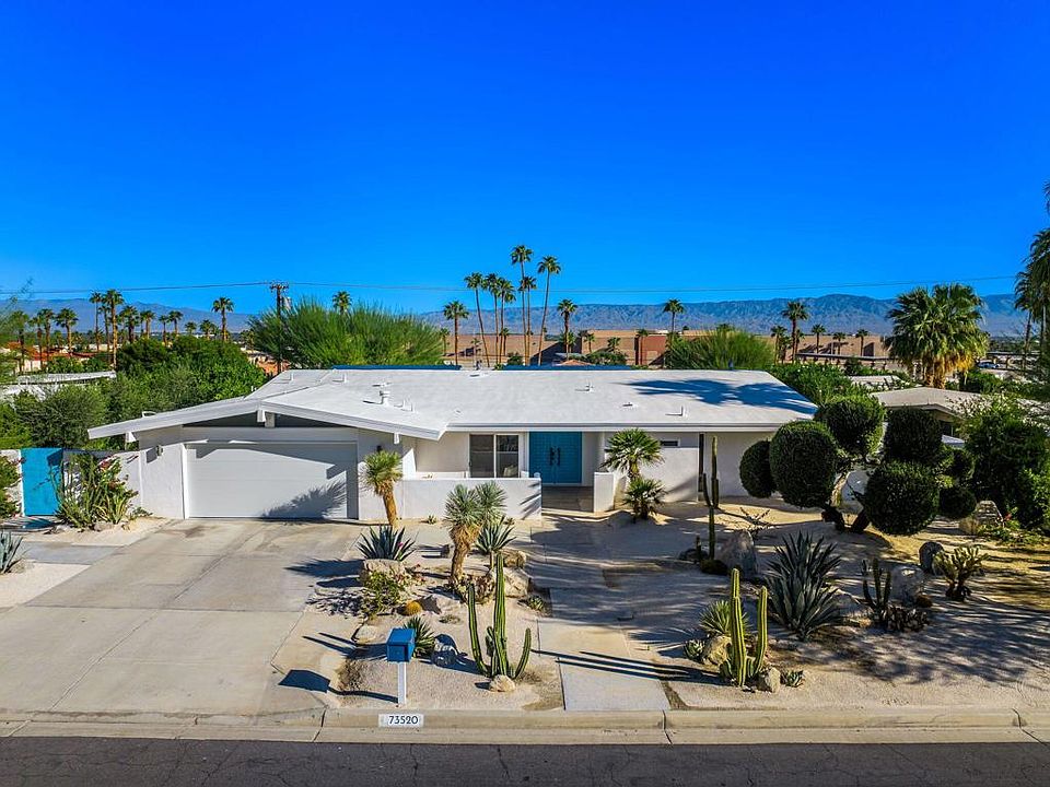 73520 Joshua Tree Street is a fully remodeled mid-century residence in South Palm Desert, nestled in a quiet, secluded neighborhood with sweeping mountain views and just blocks from El Paseo's premier dining, shopping, and cultural attractions. The home seamlessly combines modern finishes with carefully restored vintage details, preserving its architectural integrity while offering contemporary comforts for sophisticated desert living. Inside, polished concrete floors flow throughout the open-plan living, dining, and kitchen areas, which are anchored by a large kitchen island with eat-up seating, perfect for entertaining or casual gatherings. A dramatic wall of glass opens these spaces to a raised backyard terrace, creating a seamless connection between indoors and outdoors and framing scenic mountain vistas. Thoughtful spatial planning enhances both flow and privacy, ensuring that each area of the home feels purposeful and inviting. The primary suite and den occupy one wing of the home, while two guest bedrooms are positioned on the opposite side, providing separation and privacy. Multiple rooms open to patios or terraces, reinforcing the home's bungalow-like ease and celebrating the hallmark indoor-outdoor lifestyle of Palm Desert living. The tiered backyard is designed as a private retreat and entertainer's playground. A pool and spa are complemented by 2 outdoor showers, a fire pit, outdoor sauna, and expansive terrace spaces for lounging or dining al fresco, all surrounded by mature, low-maintenance landscaping. Additional highlights include a fully finished two-car garage with epoxy floors, restored original front doors with bronze hardware, owned solar, and a cohesive blend of modern and vintage design elements that convey a refined sense of style. Blending timeless mid-century character with contemporary sophistication, this residence offers elevated design, thoughtful indoor-outdoor integration, and easy access to El Paseo's lifestyle amenities, making it an exceptional opportunity for those seeking refined desert living in a serene South Palm Desert setting.