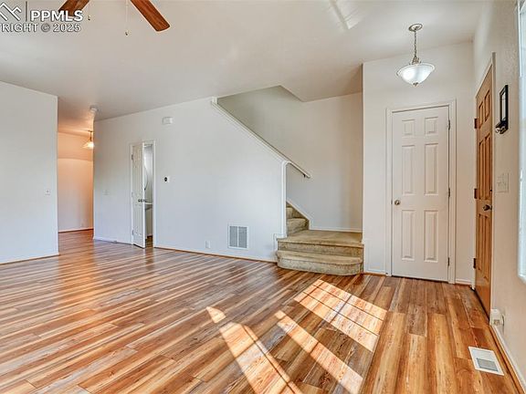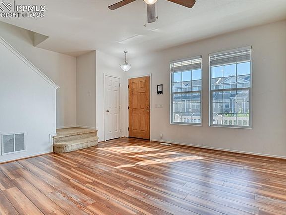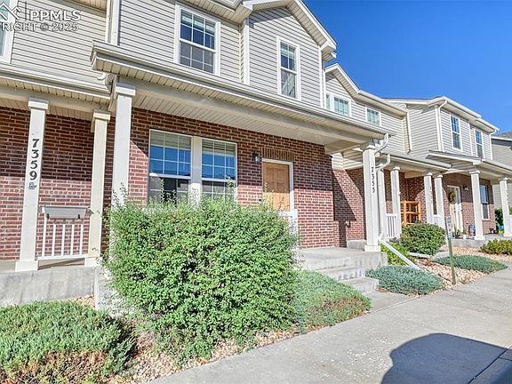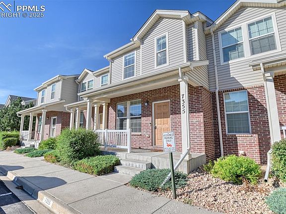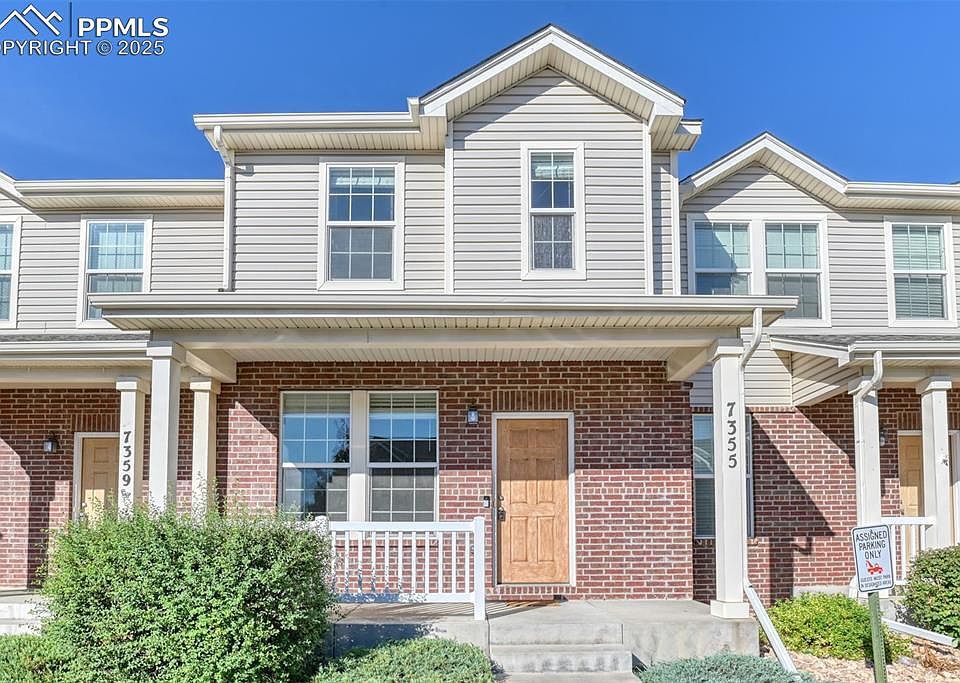 Step inside and you’ll be welcomed by the open layout that seamlessly connects the living room, dining area, and kitchen—perfect for everyday living and hosting guests. The 9-foot ceilings on the main level create a spacious and airy feel throughout. The kitchen features a dining nook, pantry, and a window over the sink that brings in natural light. A convenient half bath and access to the back of the property are also located on this level. Upstairs, you’ll find two generously sized bedrooms—one with vaulted ceilings—along with a full bathroom. The laundry area, complete with washer and dryer, is conveniently located between the bedrooms. Enjoy relaxing mornings on the wide 16-foot covered front porch—ideal for rocking chairs or an outdoor setup of your choice. For added convenience, this home comes with two reserved, clearly marked parking spaces right at your doorstep—making unloading groceries, kids, or pets a breeze. The A/C is only a year old. The location is equally impressive! You’ll be within walking distance of Fountain-Ft. Carson High School, close to trails that connect to Metcalfe Park (featuring a skate park and community market), about 1.3 miles from downtown Fountain with its library branch, and less than 4 miles from shopping and amenities along Mesa Ridge Parkway. Fort Carson is just a short 10–15 minute drive away. Don’t miss your chance to make this charming townhome yours—schedule a showing today!