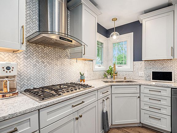 The heart of the home is its gourmet kitchen! The updated shaker-style cabinetry is complemented by striking quartz countertops and together they provide plenty of storage and countertop workspace. The large center island is a great place to gather. The kitchen also features high-end stainless-steel appliances, including dual wall ovens and a built-in gas cooktop as well as a pantry.