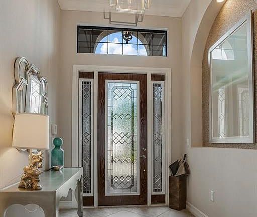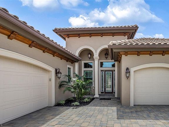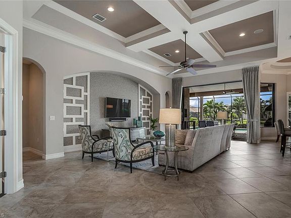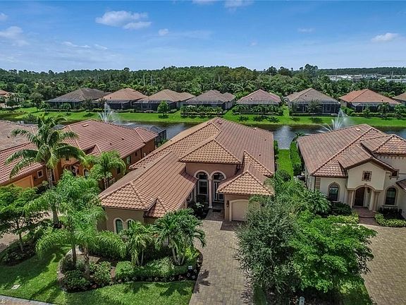 Spectacular lake and fountain views, 4Br.+study, 3.5 baths of luxury living ' Hibiscus II' Floorplan built by Stock. You are welcomed inside by a leaded impact front door with sidelights. The upgrades are numerous throughout. A eat in Kitchen with Atrium Glass window features Quartz counter tops, custom tile backsplash, 5 burner cook top, wall oven w/convect. microwave & warming drawer, easy close drawers, stainless appliances. Spacious master suite w/sitting area, large windows overlooking pool & lake, private entrance to lanai, his/her walk-in closets, separate vanities, walk-in shower & soaking tub w/ tile to ceiling & upgraded fixtures. Two guest suites w/ Jack & Jill Bath, Third cabana suite w/ Bay Windows & pool entry. French doors to Study w/ Espresso color wood flooring. Great room offers a unique Pebble accented wall paper, pocketing sliders opening up to lanai, pool & spa controlled by Aqua Link, auto-fill system, outdoor kitchen w/ Alfresco gas grill, sink, refrigerator & granite counters. More features: Volume ceilings, crown molding, recessed lighting, plantation shutters, transom windows, wood shelving in all closets, tile set on a Diagonal, & more!