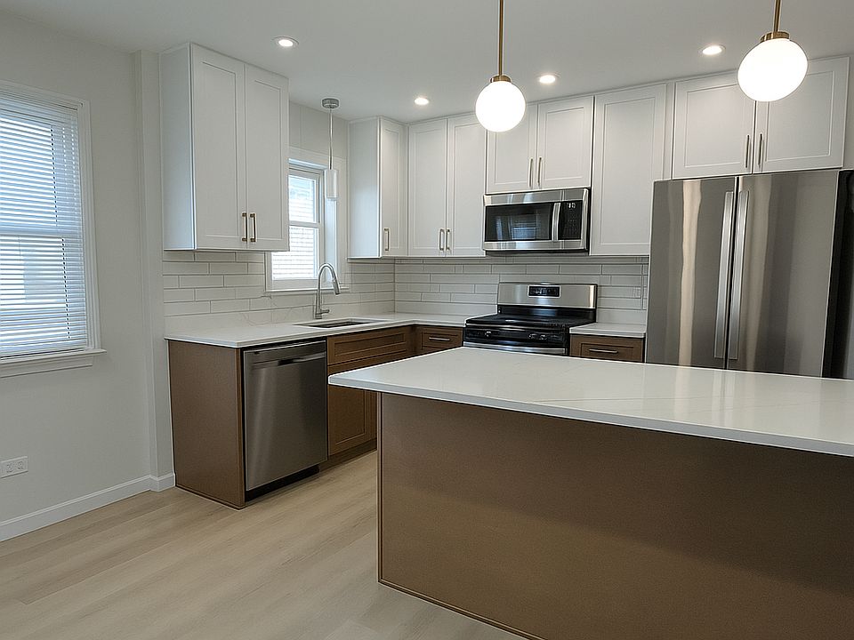 MODERN KITCHEN Eat-in layout with breakfast bar/island. All stainless steel appliances. Quartz countertops. Brand new cabinets with gold hardware. Refrigerator with water and ice dispenser.