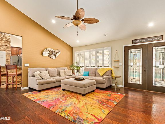 Welcome home to this comfortable and charming home located in desirable Arrowhead community. Upon entering you are welcomed by a two way electric fireplace adorned by stone hearth and mantel. The open living room with wood plank tile flooring offers view of the backyard and golf course. A cozy sitting room and front courtyard provides additional space to relax. The kitchen has been updated with a rich color palette. The Master on the main provides a spacious retreat featuring a HUGE walk in closet and access to the back yard. Upstairs you will find two bedrooms a bathroom and dedicated laundry area. The backyard features a diving pool with waterfall, cool decking, a view of the golf course and a unique perch for elevated views. This home offers you comfort, convenience and lifestyle!