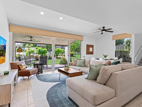 73567 Dalea is an exceptional value for a two-story home that lives like a SINGLE STORY in this prestigious community. Freshly REMODELED and turn-key furnished, this South Palm Desert retreat combines modern style with high-end finishes.The main level features bright, spacious living areas with neutral tile flooring, a beautifully updated kitchen, and a comfortable bedroom and bathroom can easily live like a one bedroom. When guests arrive, the upstairs offers 2 more bedrooms each with en suite bathrooms, one featuring its own deck and the other with a large lounge--perfect for accommodating visitors or creating a kids' getaway. HOA 1 is the only pool that remains un-fenced, which allows for a seamless flow from the living area to a backyard garden and pool/spa. The home also offers spectacular northern and southern views from the courtyard, decks, and poolside patio. Recent updates include a new HVAC system, appliances, water heater, LED lighting, carpeting, and paver stone patios and driveway. SHORT TERM RENTALS are allowed in this HOA for a minimum of 7 nights. Ironwood is beloved by all who know it. The truly stunning mountain views, incredible landscaping, and top-notch golf and fitness facilities with a super social club atmosphere make this one of the most desirable communities in the desert. (FYI: club & social memberships are separate from home ownership). Plus, Ironwood provides a private hiking trail for residents AND you are next door to the iconic Living Desert... and just 5 minutes away from Palm Desert's El Paseo, known as the ''Rodeo Drive of the Desert'' with its popular restaurants and shops and more. This home is a must-see!