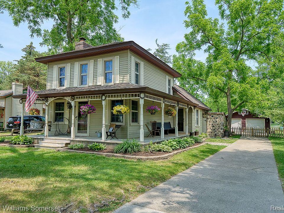 Welcome to this charming Pre-Civil War era 2-story farmhouse originally built in 1860 by Civil War soldier John J Baker. Be captivated by the remarkable character and unique elements of this historic 3 bedroom home. The sellers have lovingly cared and partially restored this architectural masterpiece for 13 years, while being mindful of the original Victorian design. Hand hewn beams and artisan detailed moldings provide the charm of yesteryear. Nestled on a 200' deep lot with an apple tree lined driveway and country style wrap around porch, this historic homestead includes a period kitchen that belongs in a museum, complete with custom farmhouse cabinets that conceal modern Samsung appliances, beautiful vintage countertops, civil war-era light fixtures. and white oak original floors. The bright, fairtale master bedroom features wooden ceilings, custom shelving, and custom valances over floor to ceiling windows. Originally built before the civil war began, this one-of-a-kind. 163 vear old light-filled wonder features a huge wood burning hearth. original cobble stone root cellar, fieldstone foundation, and even hidden rooms. Conveniently located near Macomb Orchard Trail, Stony Creek and Downtown Washington. This gem is a must see!