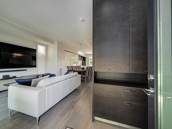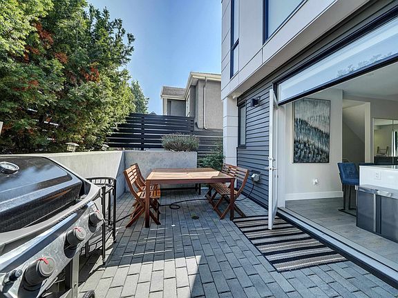 DETACHED and FURNISHED 3-story Townhouse with 1859 SF open plan. No shared walls. The finishes are contemporary and include; Bosch appliances, integrated cabinetry, 9' ceilings, engineered hardwood floors, heated bathroom floors, quartz counters, great storage, built-ins and central air-conditioning. The rooms are spacious and bright with large picture windows and contemporary window coverings. Outdoor spaces include; front entrance patio, large back patio and large balcony from primary bedroom. The patio access for kitchen to outdoor space is a wall to ceiling sliding system creating a full opening to kitchen and outdoor area.The basement features a large walk-in laundry and separate storage area - direct access to your parking.