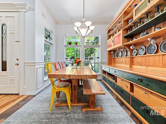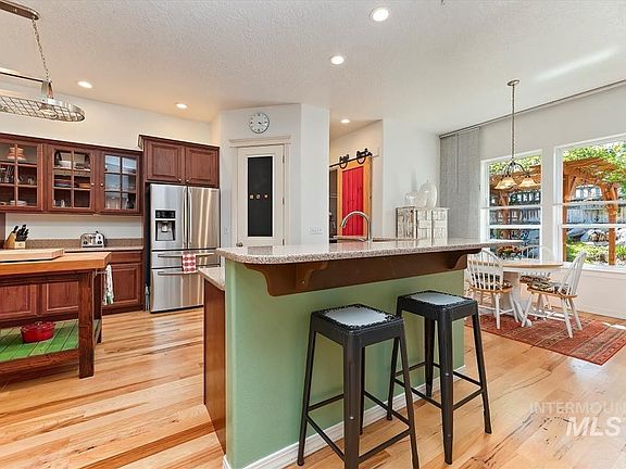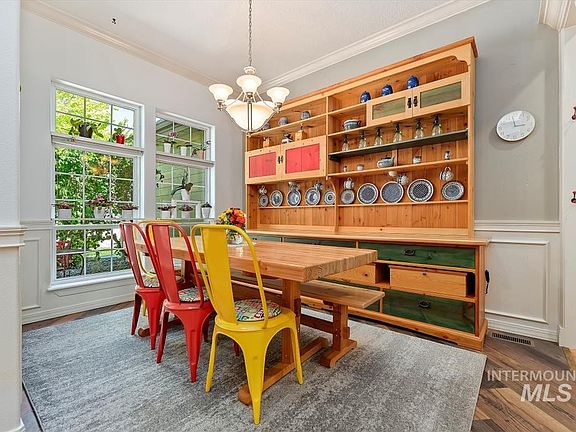 Take a lovely appointed home, add mature landscaping, mix in cheerful sounds from the nesting doves on the oversized covered patio, sprinkle with fresh veggies from the garden boxes, and you end up with a haven nestled in South Boise. From the moment you walk in you are welcomed with 10 foot ceilings, 8 foot doors, hickory hardwood floors through the main space, and expansive windows to illuminate the rooms in sunlight. At the heart of the home you will find the kitchen with an abundance of mahogany cabinets for storage, a deep corner pantry, brand new 5 burner gas range, and double islands for seating and entertaining. The primary suite offers a soaking tub, walk in closet and vaulted ceilings. The ivy-laced patio cover and extensive gardens combine to create a tranquil outdoor oasis complete with maple and cherry trees. With the storage shed, storage locker and side entry oversized 3 car garage you have room for all the tools and toys!