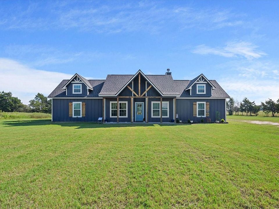 This stunning Ranch Style home, built in 2024, offers 5 spacious bedrooms, 3 bathrooms, and sits on a generous 7-acres in the peaceful countryside of Groesbeck, TX. The open, airy design with vaulted ceilings throughout the main living areas enhances the home's inviting atmosphere, perfect for family living and entertaining.