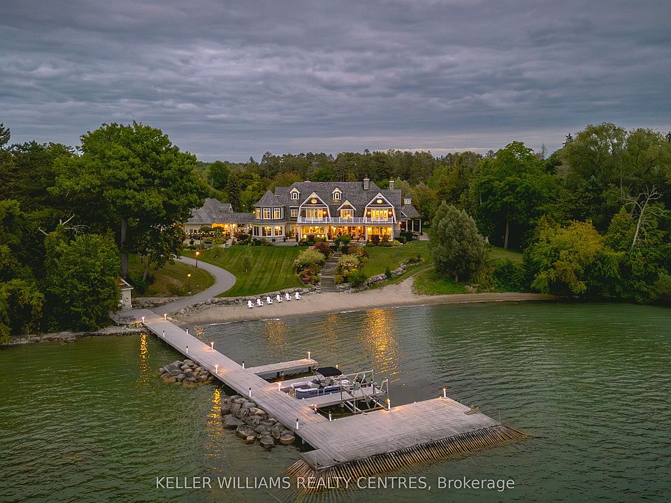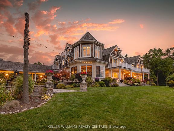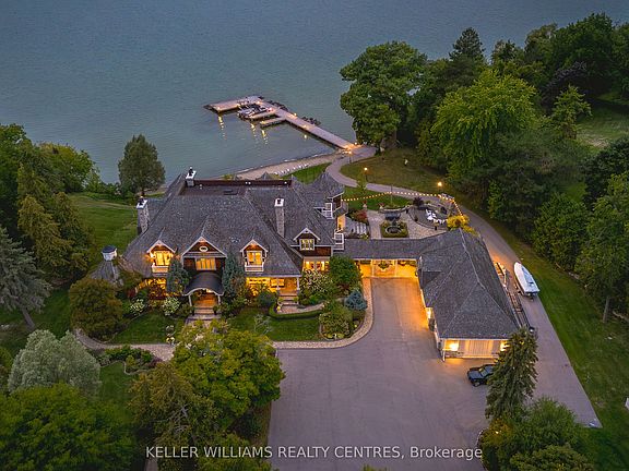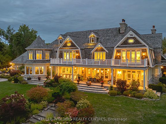 A rare opportunity to own one of Lake Simcoe's most preeminent Lakefront Estates. Set on nearly 7 acres with 280' of prime shoreline, this classic and elegant residence combines 100 year old charm & timeless craftsmanship of the Hamptons with resort-style amenities for an unparalleled lifestyle. A grand fieldstone fence, over a century old, frames the 700' frontage & sets the tone for the elegance within. Inside, every detail has been thoughtfully curated: Brenlo moldings & doors, bead board walls, 12" baseboards, tin & coffered ceilings, & replica antique push-button switches add period charm. The bespoke Bloomsbury kitchen, butlers pantry & baths feature marble counters, porcelain sinks & Gingers plumbing fixtures, 7 bedrooms & 8 bathrooms are appointed with marble and hexagon tile flooring. Rich dark stained Hemlock floors flow throughout, anchored by 8 fireplaces: 4 wood burning, 4 gas, creating warmth & intimacy. A 20' high backlit stained glass domed ceiling is the highlight of the breathtaking main hall with 2 ornate staircases and B/I bookcases. Multiple staircases connect all levels, while walkouts lead to expansive verandas, terraces & balconies with incredible lake views & year round sunsets. A 60' covered porch overlooks the lake, perfect for hosting. Outdoors, indulge in 280' of sandy beach, a 200' permanent dock with 3 boat slips & an insulated & drywalled 2250 SQ' 5 bay garage & a separate 800 SQ' garage used for landscape equipment & storage. Lusciously landscaped with perennial gardens, a fenced vegetable garden, tennis court, & an extraordinary 2,700 SQ'. patio with a historic circular bronze fountain & fieldstone fireplace create a private sanctuary. The open breezeway, black slate terraces, cedar shake roof, & Copperwork eaves exemplify enduring quality. This estate is more than a home it is a legacy property designed for family, entertaining & waterfront living at its finest.