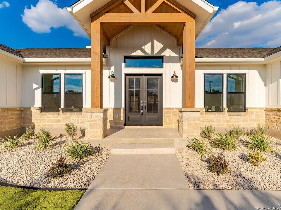 *1 year rate buydown at no cost with preferred lender Experience Hill Country elegance in this new stunning modern farmhouse located in the established community of The Crossing in Boerne, TX. Nestled on just over an acre of land, this is a 4 bed, 3.5 bath, + office home that blends luxury craftsmanship with everyday comfort. Step through the double wrought iron front doors into a bright, open living space featuring vaulted ceilings, hardwood floors, and a wood-burning fireplace, thoughtfully designed with custom details throughout. The gourmet kitchen includes quartz countertops, custom hood, huge eat-in island, and gas cooking - and the extended butlers pantry provides an additional prep and cook space - great for both entertaining and family gatherings. Seamlessly transition outdoors through the oversized patio slider to a private outdoor space equipped with an outdoor kitchen, perfect for enjoying Boerne's beautiful evenings. This property truly captures the charm of country living with modern luxury - don't miss your chance to call this retreat your own.