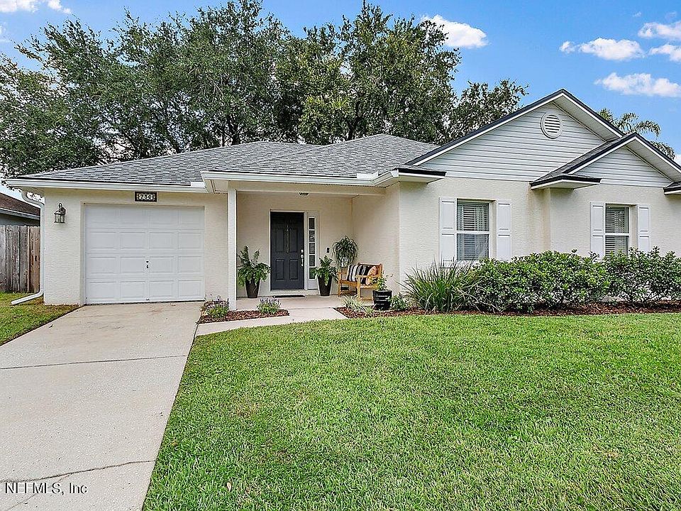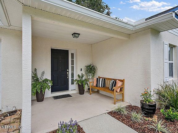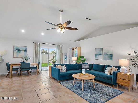 Cute 1 story home is in a prime location for easy drives to beautiful beaches, Intracoastal Waterway and historic downtown St. Augustine with its vibrant atmosphere. Covered front porch welcomes you to step into this home with a spacious floor plan and lofty ceilings. The Open Concept of Family/Dining/Kitchen makes for easy entertaining. Kitchen has bar seating, double SS Sink overlooking backyard, pantry, newer Stove (2024) & Fridge (2023). From the Family Room there is a sliding door with access to a quaint back deck and fenced backyard. Primary bedroom has a private en suite bathroom and large walk-in closet. 2 additional rooms have vaulted ceilings & share a hall bathroom with shower/tub combo. Interior laundry is in 1 car garage. Roof: 2018 HVAC: 2022 Water Heater: 2021 Sliding Door: 2020. Home was built in 1996 and is constructed of masonry block with stucco finish. Community pool, playground and large open field offered in this low HOA neighborhood, and no CDD fee