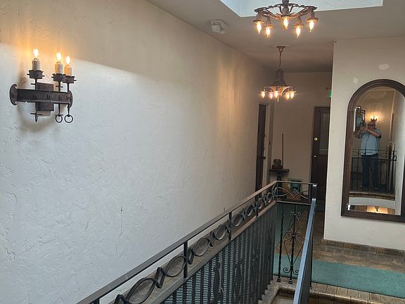 Generously sized bedroomPeriod chandeliersWall sconcesWood beamed ceilingsCrown moldingsSeparate dining areaOriginal deco-tiled bathroom