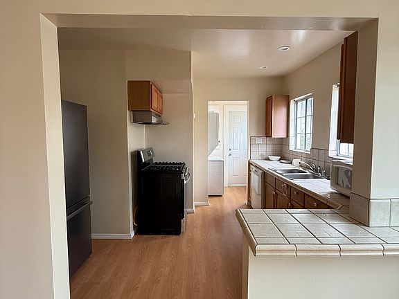 Upper duplex unit with 2 bedrooms and 1.5 bathrooms. This spacious, bright, and airy unit features a large living room with plenty of windows, a dining area, and a well-equipped kitchen with a breakfast space. Laundry area includes washer and dryer, with convenient access to the backyard and garage. Comes with a private one-car garage and an additional parking space in a gated driveway. Located just a few blocks from shopping, restaurants, and markets.