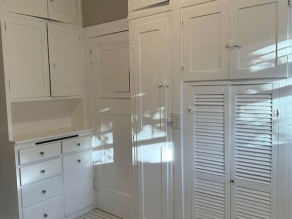 A standout feature is the spacious walk-in closet, complete with built-in drawers and a convenient countertop dressing area. It provides storage and organization options not typically found in a studio apartment. Fresh paint, classic trim details, and original tile add to the timeless appeal.