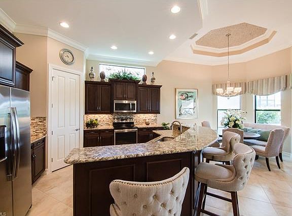WOW truly a must see home...Montessa floor plan in Lantana community of Olde Cypress Country Club. Enjoy spectacular water & fountain views from this stunning southern exposure home. This floor plan offers a beautiful open design featuring soaring ceilings, custom crown moldings throughout, beautifully designed & decorated by Robb & Stucky Interiors w/ high end furnishings, area rugs, wall coverings, window treatments & designer lighting fixtures which are all negotiable. Gourmet kitchen w/ Upgraded cabinetry, granite counter tops & stainless steel appliances, butlers pantry. Large expanded lanai w/ state of the art pool/spa. The owners suite includes 2 walk in closets w/ home safe, luxury bath w/ soaker tub, walk in shower w/ glass enclosure & double vanity. 2 additional bedrooms share adjacent bath. Beautiful wood flooring adorns the study/4th bedroom. Laundry room offers built in utility sink & premium cabinetry. 3 Car Garage features an epoxy floor w/ built in cabinetry & shelving. All doors & windows are IMPACT RESISTANT. Beautifully landscaped. Olde Cypress, a gated community, features an award winning Clubhouse. Minutes to beaches, shopping and dining.