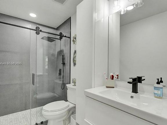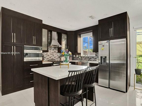 The interior boasts impact windows, a sleek modern kitchen with stainless steel appliances, quartz countertops, and beautifully remodeled bathrooms that enhance the home's contemporary design.