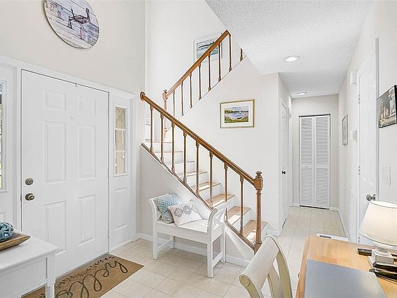 This updated and meticulously maintained condominium offers 3 bedrooms, 2.5 bathrooms, and 2,177 square feet of comfortable living space. The upgraded kitchen features rich wood cabinetry, quartz countertops, and newer stainless steel appliances, while a separate laundry room provides excellent storage and convenience. A spacious dining area with a bay-style window and plantation shutters leads into the large family room, where soaring vaulted ceilings create an open, airy feel. The owners’ suite is located on the main level and includes sliding doors that open to the lanai, where tranquil views of the expansive lake set the scene for relaxation. Upstairs, two additional bedrooms and a full bath are connected by a loft-style hallway overlooking the family room below. Both air conditioning systems were replaced in 2024, complete with duct cleaning, and while the tile roof is 18 years old, full replacement is included in the HOA, along with exterior building maintenance and lawn care. This home has a whole home water purification system and kitchen reverse osmosis by Culligan. Also, hurricane shutter package the owners installed and easily to close up if needed! Set within the gated community of Bent Tree Village, residents enjoy a peaceful environment where single-family homes and villas are surrounded by nature. The neighborhood offers a lakeside gazebo in a park-like setting, where deer can often be spotted roaming freely. Hammock IV, the condominium enclave of Bent Tree Village, provides residents with access to two community pools, each with showers and restrooms, making it an ideal retreat to enjoy Florida living at its best. This is a 55+ Community.