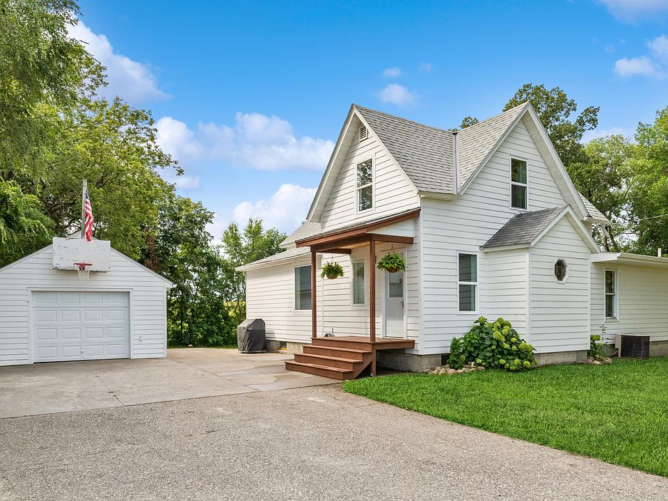 Remodeled farmhouse in the country on just under an acre! This 3 bedroom, 2 bathroom home has seen many updates. Remodeled kitchen and bathroom. Since 2016, updated hardwood floors, siding, roof, and furnace. The primary suite has a private bathroom and is located on the main level. Enjoy the freshly poured patio. For additional storage, there is a 14x24 shed in the backyard. This home is sure to please.