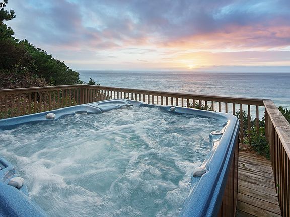 Imagine seeing staggering Pacific Ocean Views where nature paints world class sunsets & original vistas for you every day! You'lllove how the home is tucked away on a quiet oceanfront road, nestled in the trees offering you a pristine, private setting. Authentic beach cottage boasts soaring vaulted & beamed ceilings w/huge sheets of glass from floor to ceiling to bring in the natural light & ocean experience. Enormous deck with hot tub