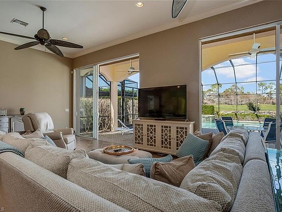 Lake and Golf Course Views overlooking the 18th Fairway, located in Olde Cypress. Furnished 3+Den (Optional 4th Bdr.) 3 Baths, great room floor plan. Kitchen: Granite counter tops, center island w/ an additional sink, stainless appliances, 5 burner electric cooktop, wall oven, breakfast bar, and separate formal dining room. Master retreat w/ separate his/her closets, French doors to lanai, spacious master bath w/ walk-in glass shower & soaking tub. Two guest bedrooms: 1st Bedroom private en-suite w/ full tub/shower combo, 2nd bedroom w/ walk-in closet access door to third bath with a walk-in shower. Den (optional 4th Bdr.) French doors & closet. Spacious Great Room w/ two separate sliding glass doors overlooking the pool and spectacular views. Other features Plantation shutters, high ceilings, and crown molding. Spacious lanai offers plenty of room for entertaining family and friends, heated pool and raised spa controlled by the in house Aqualink system. Laundry room w/ sink and storage cabinetry. Two car side load garage w/ built-in cabinetry. Olde Cypress is a low-density gated community w/ approximately 550 single family homes, located in N. Naples, a Social Membership is required for all homeowners at the Club at Olde Cypress which allows residents to use the clubhouse facilities which include club activities, fine & casual dining, tennis, pickleball, swimming pool, fitness and meeting rooms. Residences of the community may enhance their privileges by upgrading to a Golf Membership or Associate Membership.