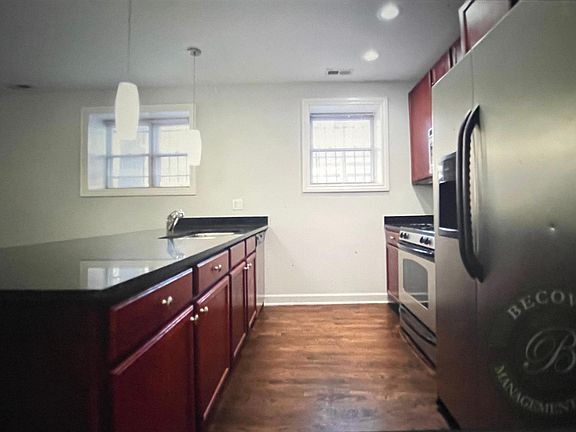Breakfast bar counterIn unit laundryDark hardwood flooringDark cherry kitchen cabinetsTwo renovated bathroomsBackporch sitting area