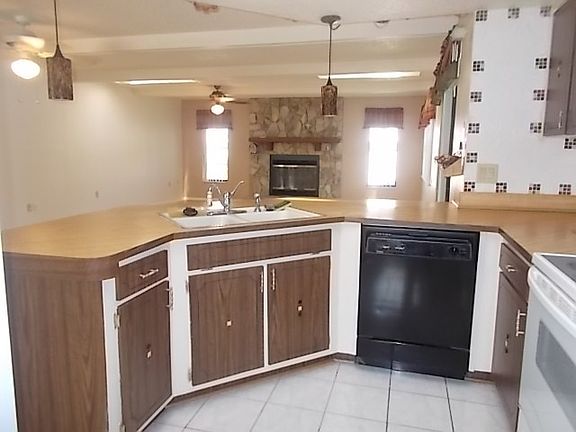 Spacious 2/2/2 home on a large corner lot. This homes has a sunken living room, wood burning fireplace in the Family Room. Kitchen has refrigerator, stove and dishwasher. Wood laminate and tile flooring throughout with carpet in the master bedroom. Screened patio off the master bedroom where you can place a hot tub. Another enclosed porch with a/c wall unit and pet door leading out to a picket fence for pet. Lots of storage shelves and cabinets in the garage.