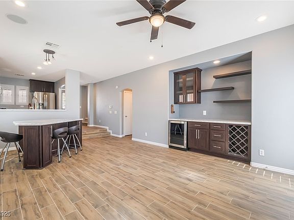 Luxury flooringCustom built-out closetBuilt-in barSpacious primary suiteMarble countertopsUpdated kitchenStainless steel appliances