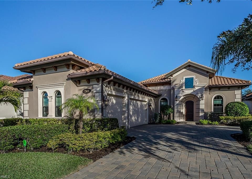 Pristine home built by Stock Development, Montessa Model with 3+Den, 2Bath. Large open Great Room floor plan. Beautiful white kitchen with Shaker style Cabinetry w/ crown molding, granite countertops, tile backsplash, under counter lighting, stainless appliances, & walk-in pantry, dinette for casual dining and separate formal dining area. Great Room w/ dry bar, volume ceilings, coffered & crown moldings w/ recessed lighting. French doors to study with closet. Spacious master suite w/ separate access door to lanai, large windows, his/her walk-in closets, separate vanities, walk-in shower & soaking tub. Separate bedrooms with a bath between w/ walk-in shower. Expansive lanai w/ heated pool, sun shelf, & spa controlled by Pentair System in the home, overlooking lake & fountain, great for entertaining family & friends. Three car side load garage. Included is all the lanai furniture, 3 televisions, & garage storage cabinets. Electric shade on Living Room Sliders.